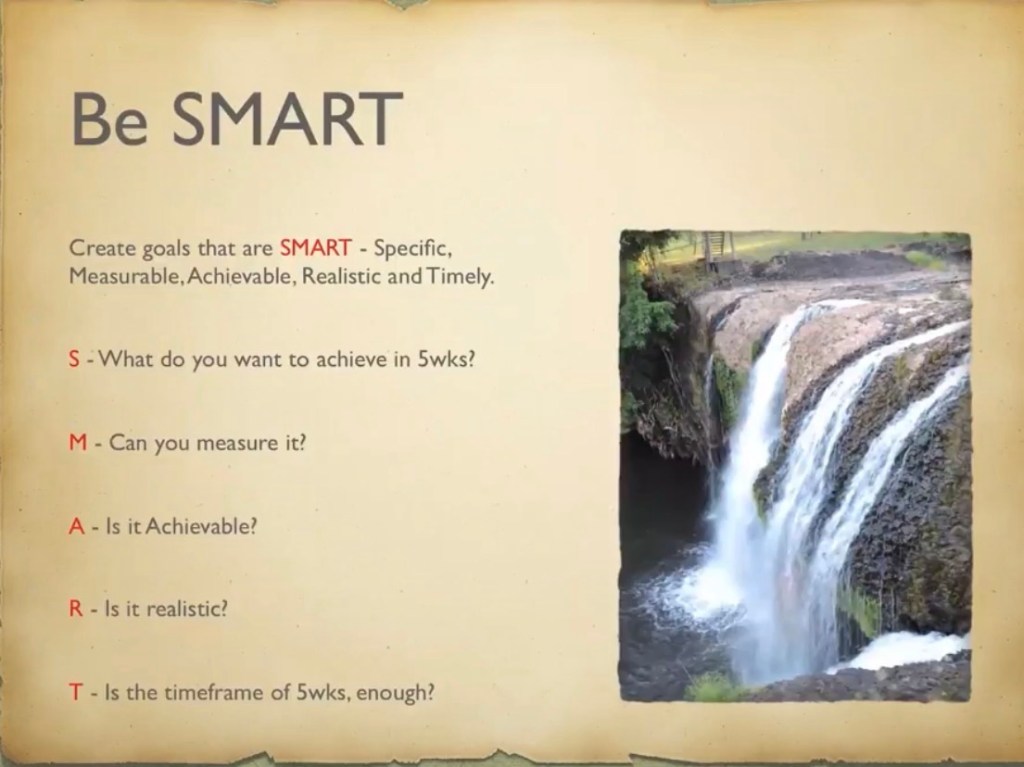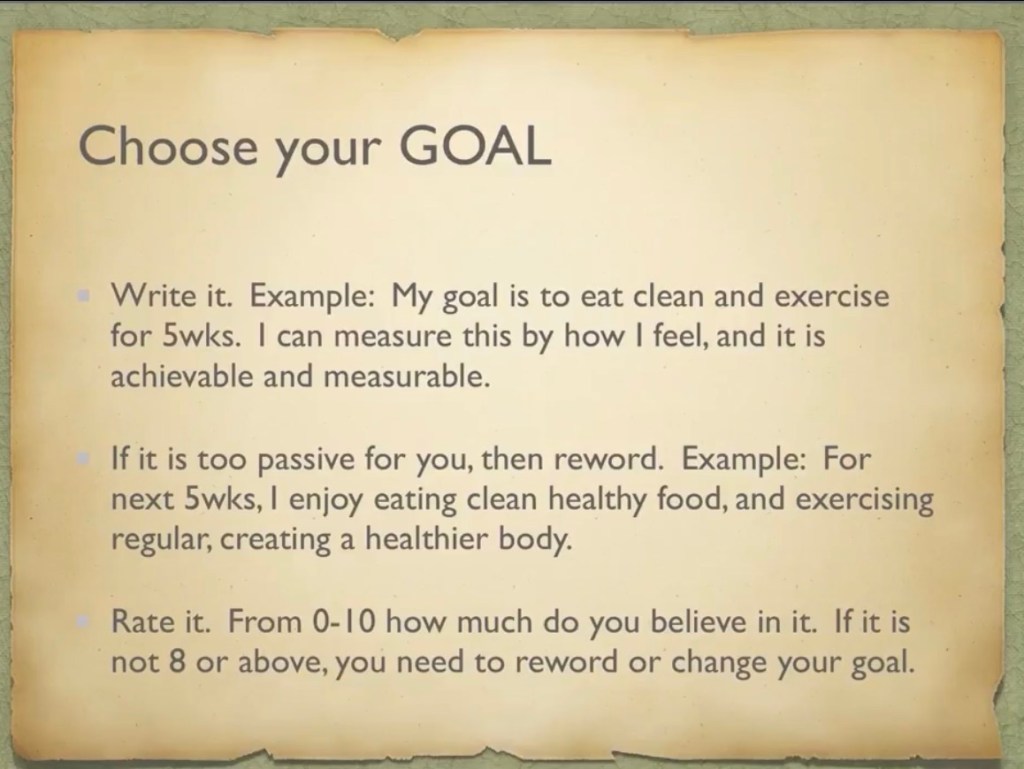 Wk1 Goal Setting – decide what you are ready to do. Write it out in any affirmation. Make sure you are 100% supportive of your own goals. Be SMART about it & Find your treasure.